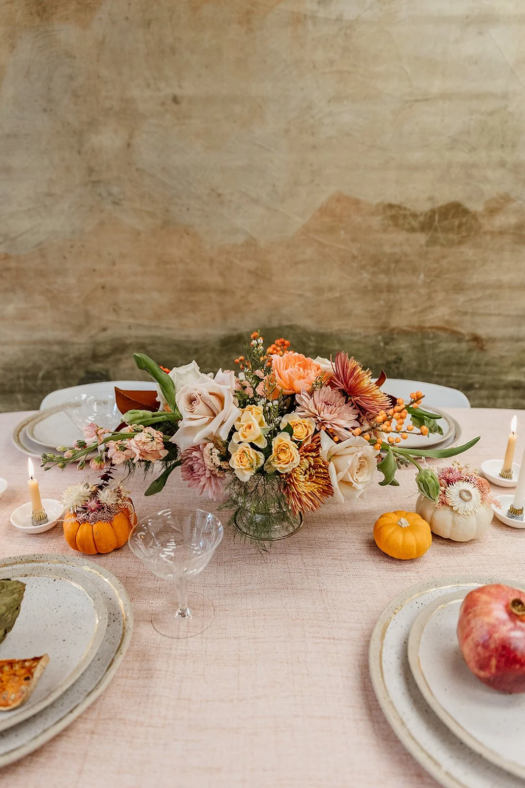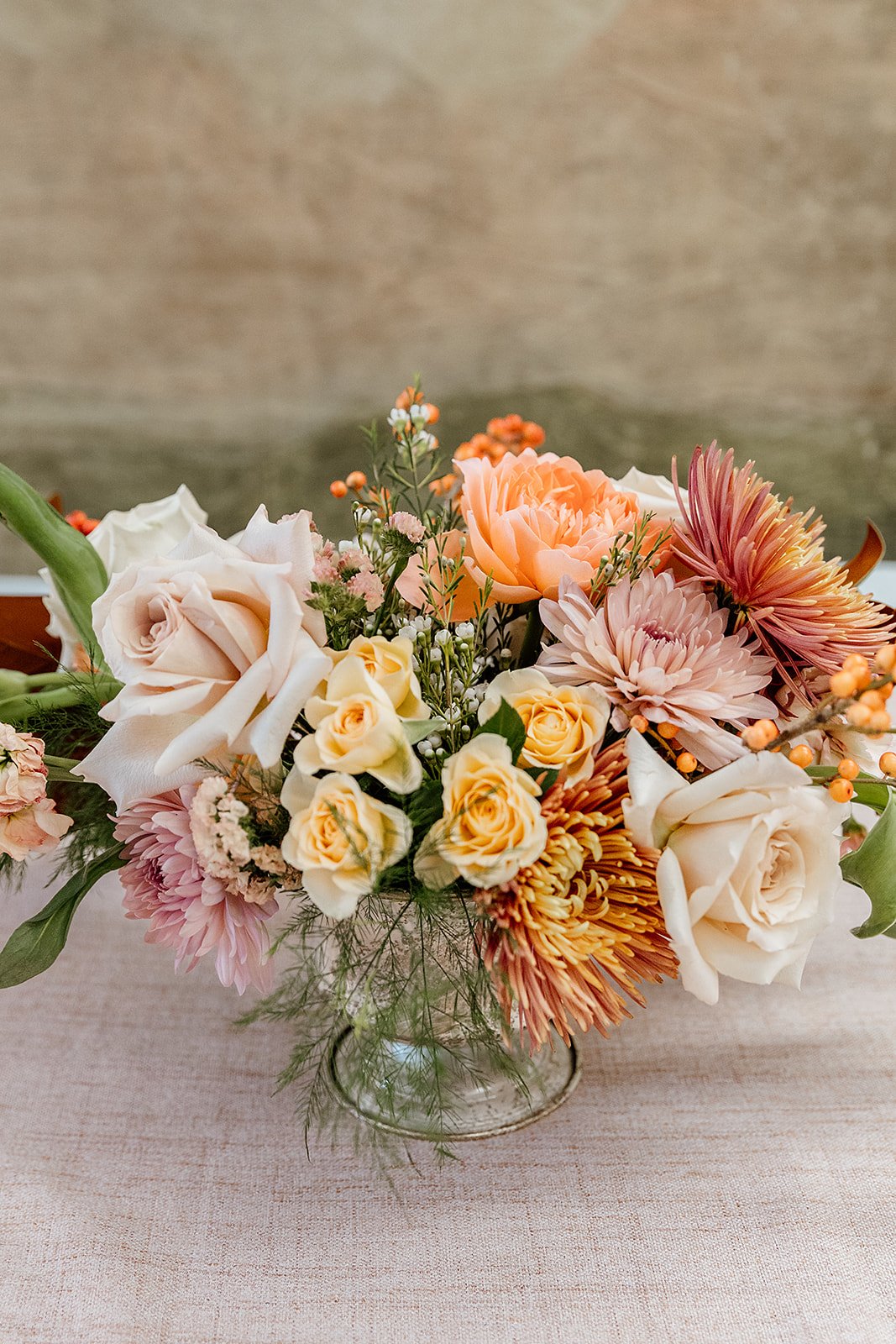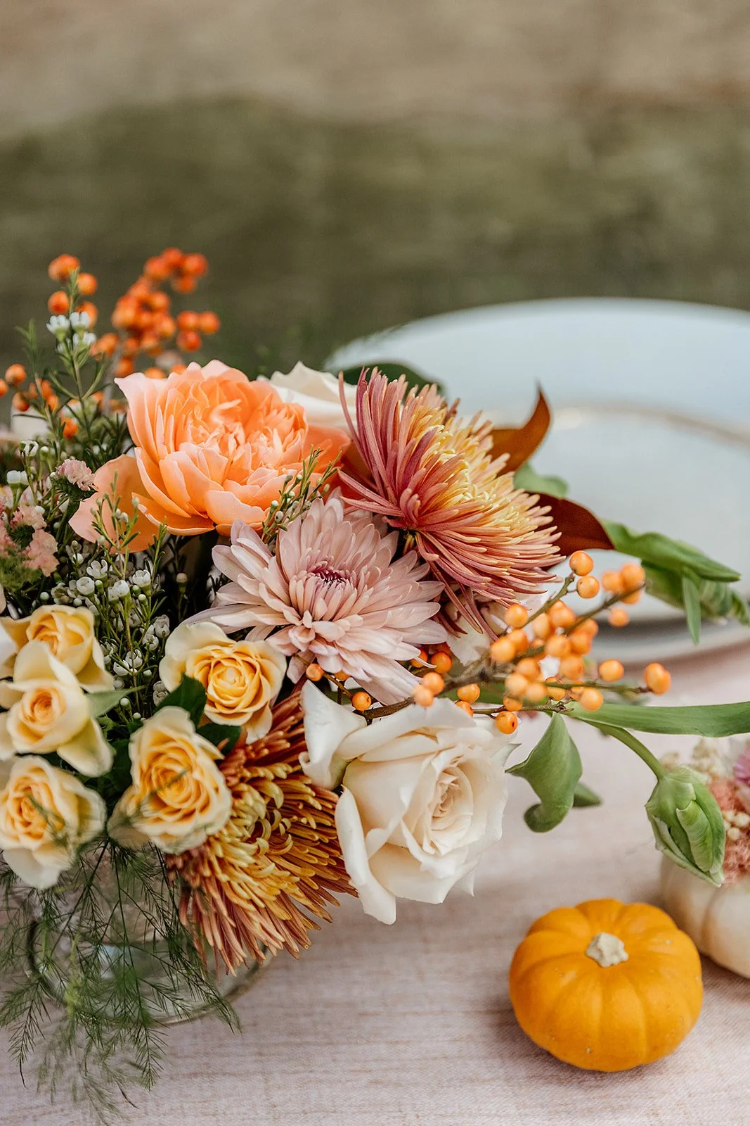 Celebrate the season with the Harvest Harmony arrangement. This design features warm autumnal fall flowers including roses, berries, magnolia, mums, and fall textures. Each piece is thoughtfully arranged in a matte ceramic or wood rectangle vase. Perfect for a long table.